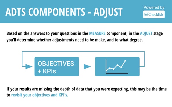 Based on the answers to your questions in the Measure component, in the Adjust stage you’ll determine whether adjustments need to be made and to what degree.