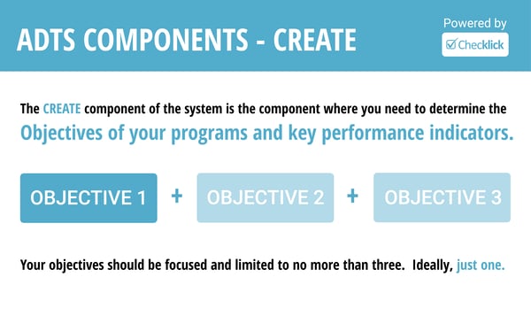 The Create component of the system is also the component where you need to determine the objectives of your programs and key performance indicators. Your objectives should be focused and limited to no more than three. Ideally, just one.