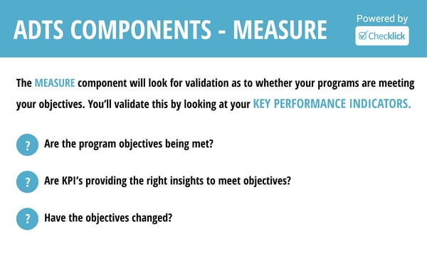 The measure component will look at the objectives you established and look for validation as to whether your programs are meeting your objectives. You’ll validate this by looking at your key performance indicators. This is where the effectiveness of the skills checklist you created in the Create stage will become evident.