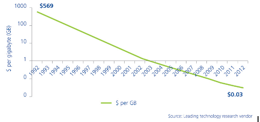 Today, entry and extraction of data can be automated through software and storage capacity is almost limitless. Consider the diagram below to get a perspective on the evolution of digital storage costs over the years.